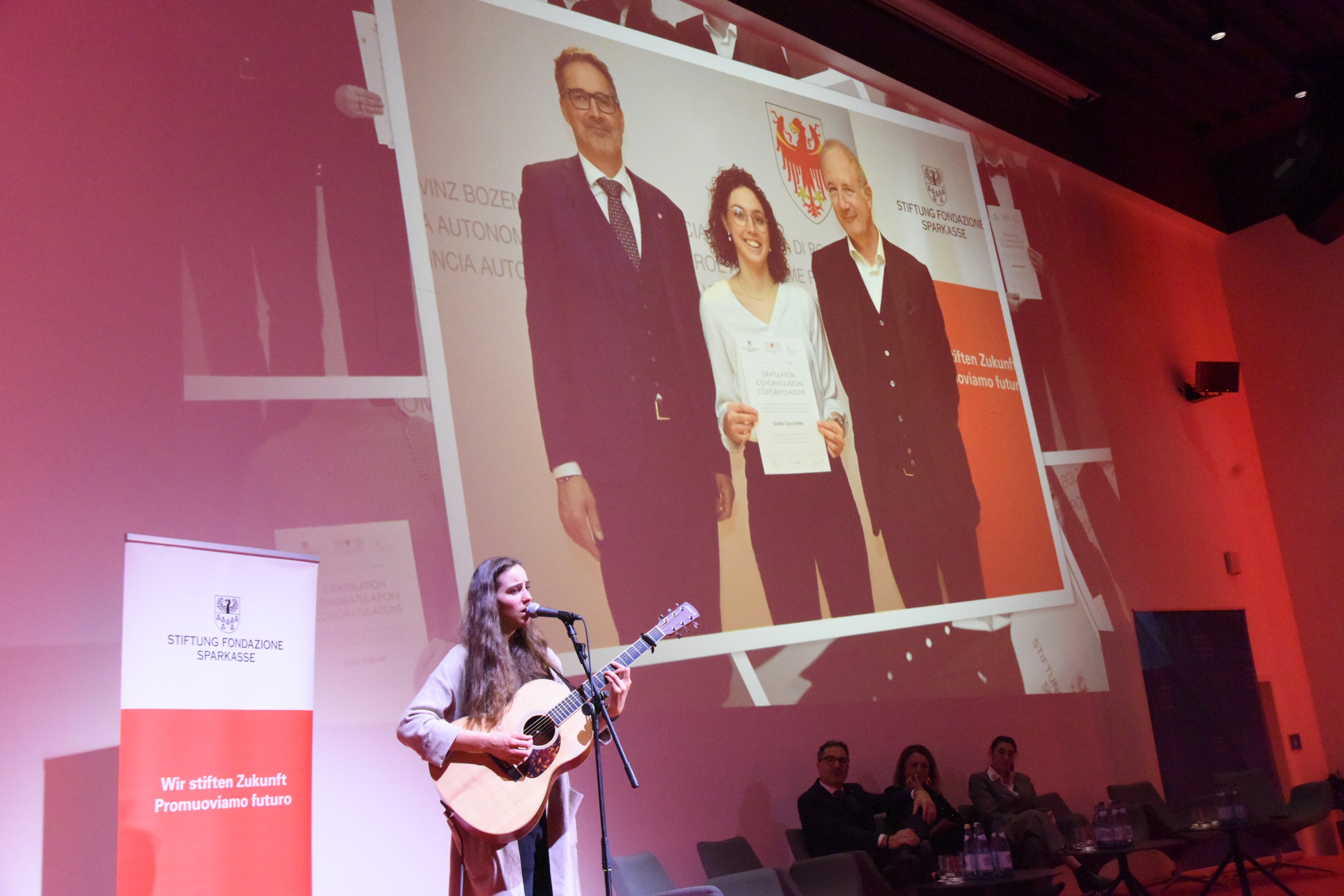 L'ex diplomata Sarah Russo (nella foto a destra) racconta la sua carriera scolastica al presidente Arno Kompatscher e alla presentatrice Barbara Brugnara. (Foto: Fondazione Cassa di Risparmio/Ochsenreiter)