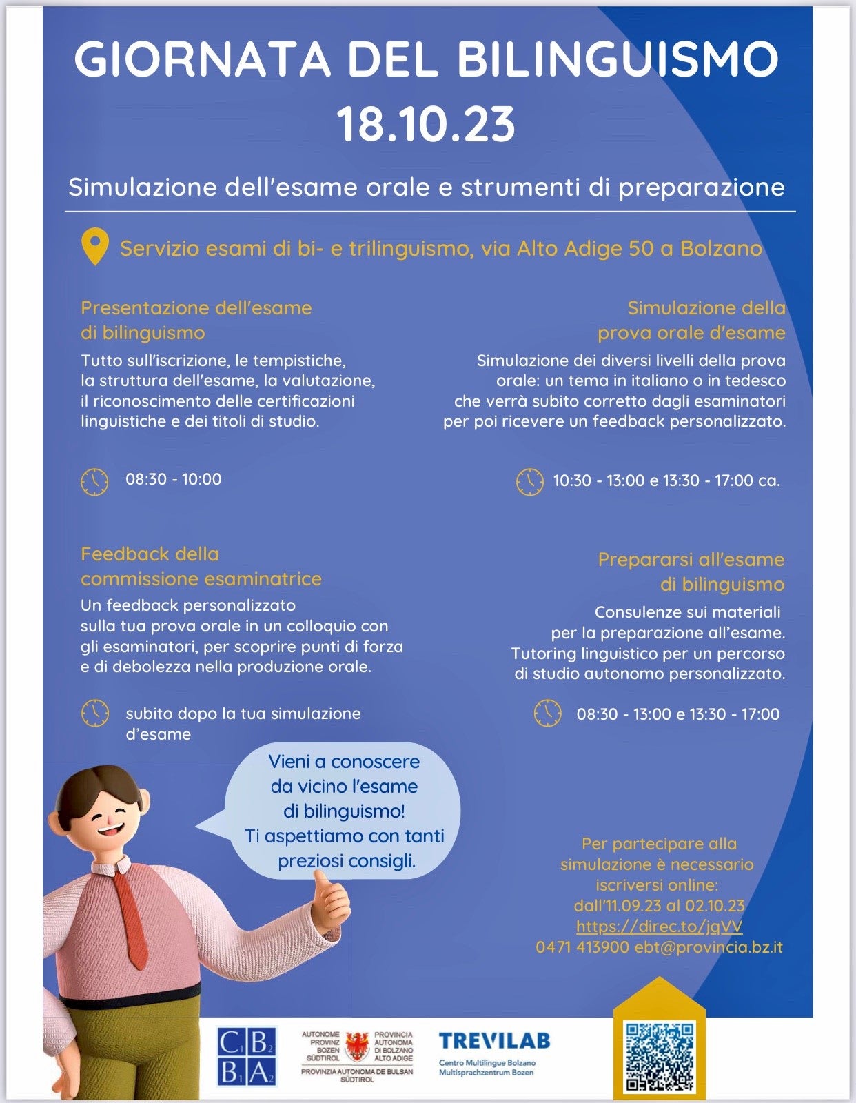 In occasione della Giornata del bilinguismo, mercoledì 18 ottobre, il Servizio esami di bi- e trilinguismo, offre in via Alto Adige 50 a Bolzano, una serie di proposte formative e informative gratuite dalle ore 8.30 alle 17.00.