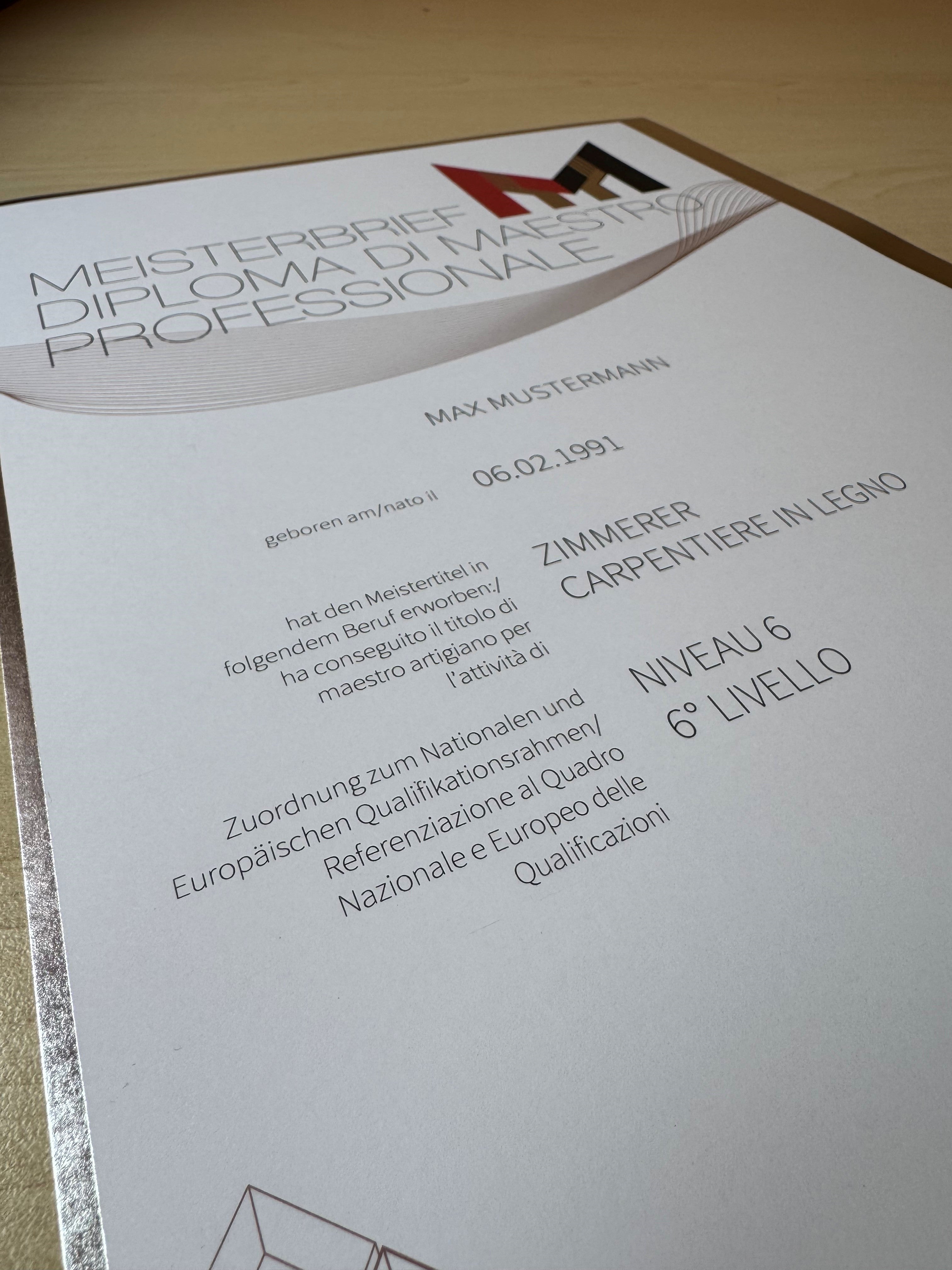 - Facsimile del certificato di maestro artigiano per l'assegnazione al livello 6 del quadro nazionale e quindi anche europeo delle qualificazioni (Foto: USP/Ufficio Apprendistato e formazione dei maestri professionali). » [IMG 1 MB]