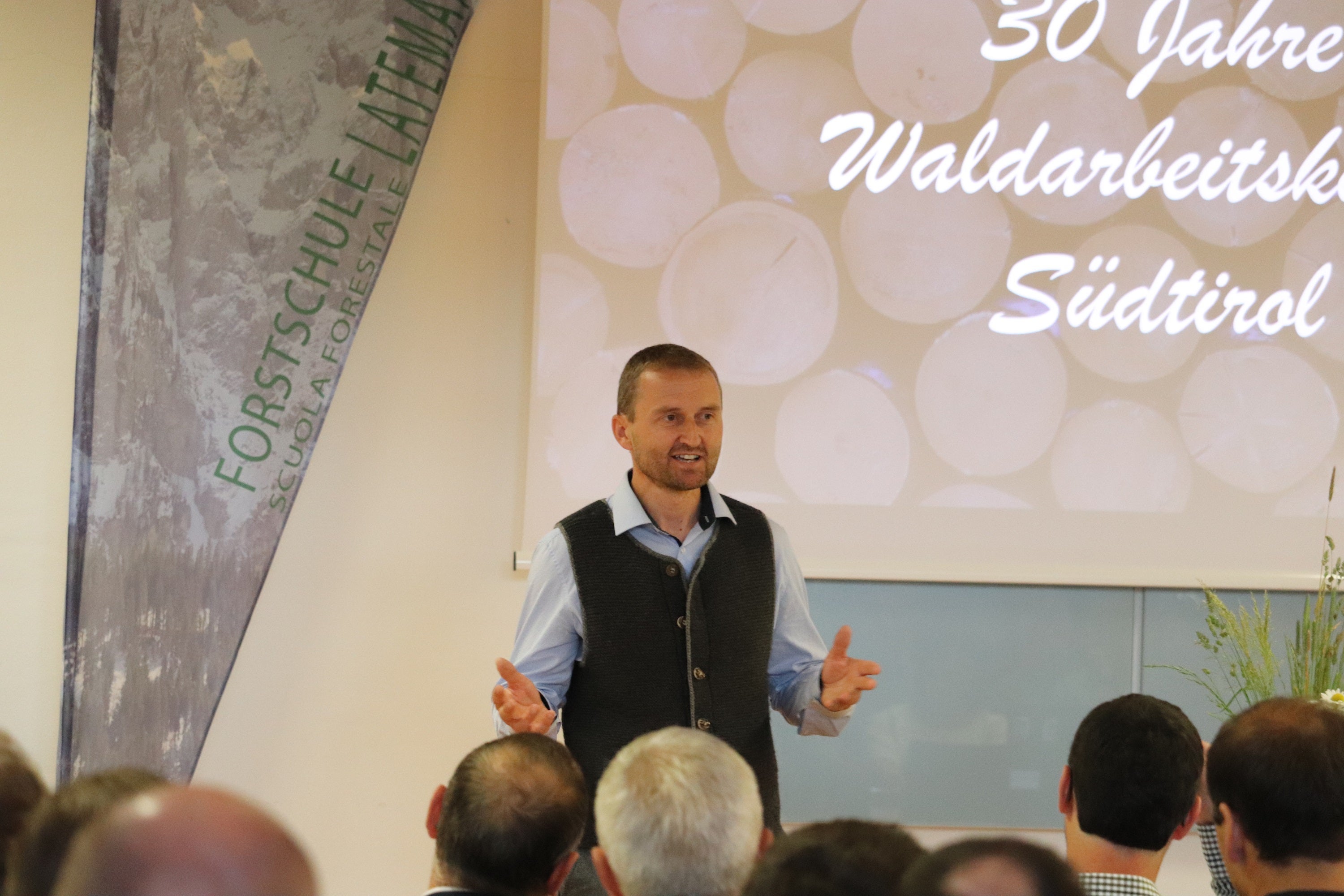 - Florian Reichegger, direttore della Scuola forestale Latemar da quattro anni, ha dato il benvenuto anche a istruttori, coordinatori, presidenti delle Comunità comprensoriali, rappresentanti di realtà come Rotholz e WaldSchweiz, un'organizzazione che è stata coinvolta fin dall'inizio, rappresentanti dei Vigili del fuoco, sia del Corpo permanente sia dei volontari, rappresentanti dell'Ispettorato del lavoro e del Bauernbund. (Foto: USP/Maja Clara) » [IMG 1 MB]