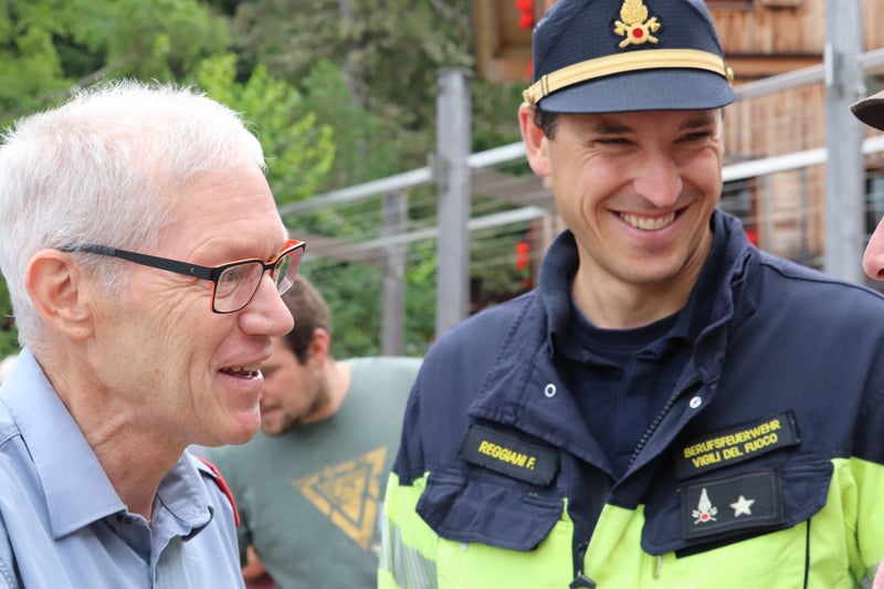 - Sono stati compagni fin dall'inizio del programma di formazione (da sinistra): Christoph Oberhollenzer, direttore dell'Unione provinciale dei corpi dei vigili del fuoco volontari dell'Alto Adige, e Felix Reggiani del Corpo permanente dei vigili del fuoco di Bolzano, che è stato coinvolto nei corsi forestali fin dall'inizio. (Foto: USP/Maja Clara) » [IMG 1 MB]