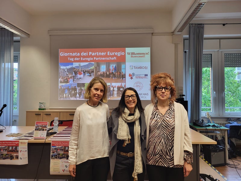 - Il progetto è stato coordinato dai docenti dei tre istituti: nella foto (da sinistra) Ilaria Ricci (ITE A. Tambosi), Alessandra Sambin (FOS Marie Curie) e Federica De Nisco (ITE A. Tambosi). (Foto: Euregio) » [IMG 943 kB]